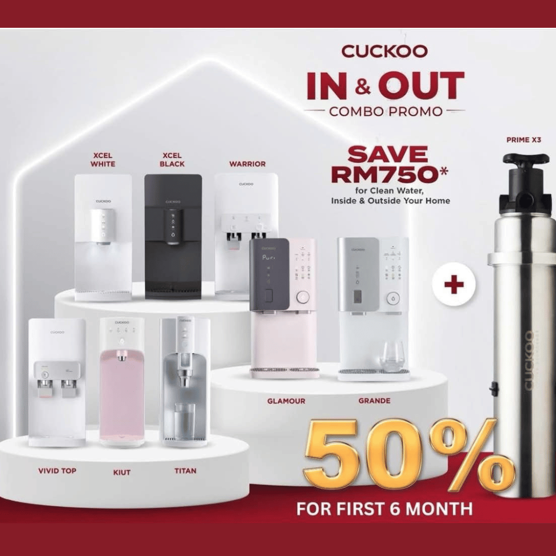 Upgrade your home with CUCKOO’s In & Out Combo Promo and enjoy clean water inside and outside. Save up to RM750 with your choice of indoor purifier plus the Prime X3 outdoor filter, complete with service and warranty.